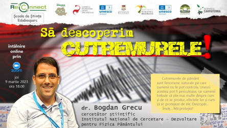La întâlnirea online elevi-cercetători de ieri, dr. Bogdan Grecu, cercetător științific la Institutul Național de Cercetare-Dezvoltare pentru Fizica Pământului, le-a vorbit elevilor și profesorilor școlilor din cele 4 geoparcuri despre cutremure, despre cum se formează acestea și despre tectonică planetei.