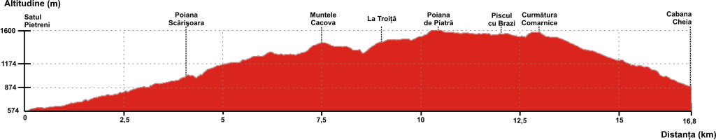 Satul Pietreni (racord traseul 3) – Valea Pârâului Sec (Valea Morii) – Poiana Scărişoara (racord traseul 6) – Muntele Cacova (racord traseul 11) – La Troiţă (racord traseul 6) – Poiana de Piatră – Poiana Faţa Piscului (Poiana Frumoasă) – Curmătura Comarnice (racord traseele 10, 17, apoi comun cu traseul 17) – Cabana Cheia (racord traseele 12, 13, 14, 15, 18)