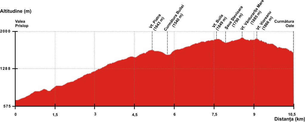 Valea Prislop (Izvorul Priboi) (racord traseul 3) – Muntele Cacova (racord traseul 5) – Vârful Piatra (1643 m) – Curmătura Builei (racord traseele 6, 7) – Vârful Vânturariţa Mare (1885 m)