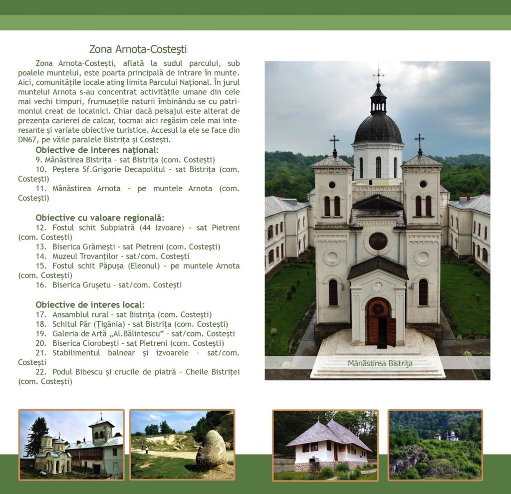 În parcul național sau îmediuat lângă acesta, se află mănăstirile Bistrița și Arnota, schiturile Pătrunsa și Pahomie, cele două biserici rupestre din Peștera Liliecilor, bisericile fostelor schituri Păpușa și 44 Izvoare.